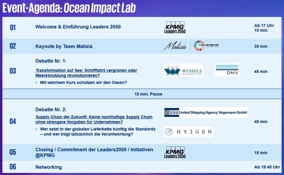 Bei unserem Leaders 2050 Event „Ocean Impact Lab“  gehen wir gemeinsam der Frage nach, wie innovative Ansätze, neue Technologien und kollaborative Formate den Schutz unserer Meere stärken und beschleunigen können.